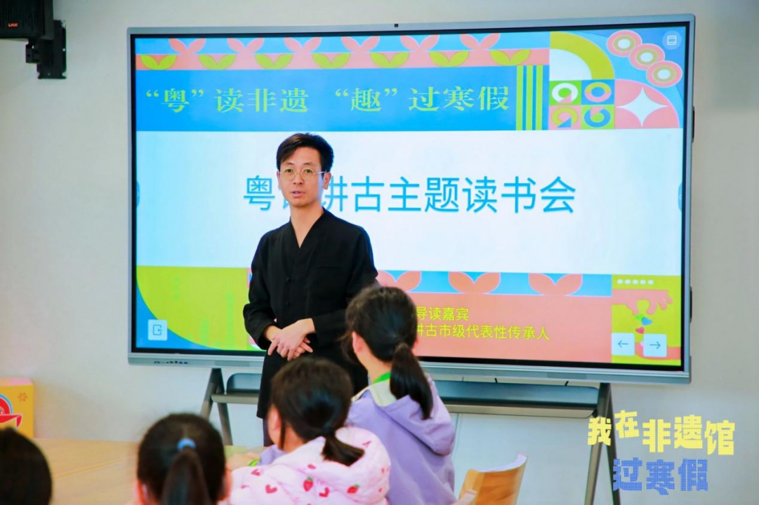 逢周六下午举办的“粤读非遗,趣过寒假”主题读书会,邀请多位非遗传承人及文化嘉宾现场导读,带领大小朋友走进书香弥漫的非遗世界。粤语讲古市级代表性传承人彭嘉志以生动地道的粤语,讲述老广州的街头巷尾故事。《老广新游》系列图书作者王大欣带来《粤港澳大湾区非遗地图》插画分享会,讲述创作背后的采风趣事。