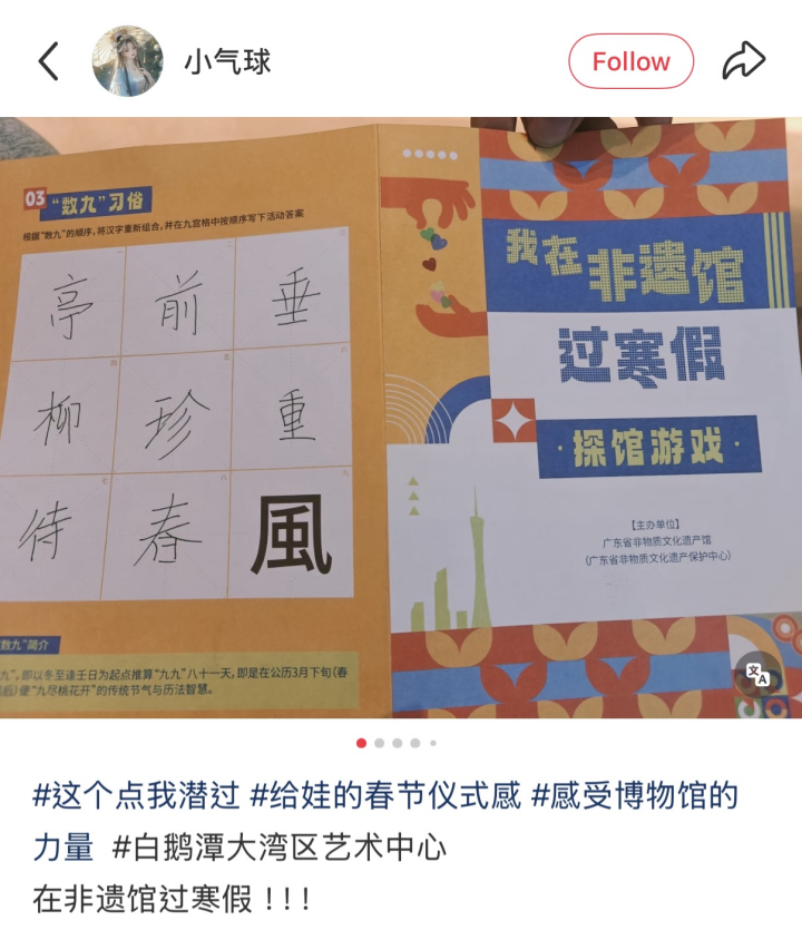 活动的点睛之笔,是将中国传统历法中“九九消寒图”与“写九”习俗巧妙融入解谜环节。成功解谜后,市民游客不仅收获了定制冰箱贴,更纷纷将探馆趣事、解谜心得分享至小红书、微博等社交平台,#我在非遗馆过寒假#话题热度持续攀升。